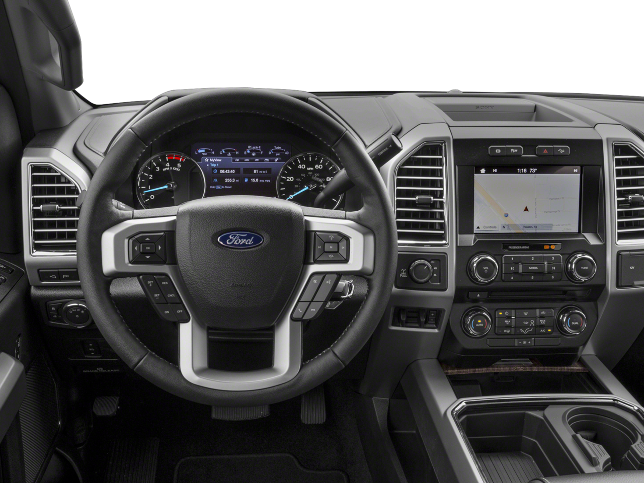 Inside, the Lariat's premium cabin sets a new standard for comfort and technology. Enjoy the convenience of SYNC 3 with Apple CarPlay and Android Auto, a premium Sony audio system, and a 360-degree camera system for effortless maneuvering. The leather-wrapped steering wheel, heated and cooled front seats, and power-adjustable pedals add a touch of luxury to every drive.