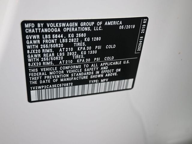 Recent Arrival! Volkswagen of Beaumont is proud to present you with another True Market Priced Pre-Owned Vehicle. This 2019 Volkswagen Atlas 2.0T SE w/Technology w/Technology is loaded with the following Factory Options: 18 5-Spoke Wheels, 3.60 Axle Ratio, 3rd row seats: split-bench, 4-Wheel Disc Brakes, 8 Speakers, ABS brakes, Active Blind Spot Monitor, Air Conditioning, Alloy wheels, AM/FM radio: SiriusXM, Auto-dimming Rear-View mirror, Automatic temperature control, Brake assist, Bumpers: body-color, Compass, Delay-off headlights, Driver door bin, Driver vanity mirror, Dual front impact airbags, Dual front side impact airbags, Electronic Stability Control, Emergency communication system: VW Car-Net services (capabilities require enrollment or subscription), Exterior Parking Camera Rear, Forward collision: FCW w/Autonomous Emergency Braking mitigation, Four wheel independent suspension, Front anti-roll bar, Front Bucket Seats, Front Center Armrest, Front dual zone A/C, Front fog lights, Front reading lights, Heated Comfort Front Bucket Seats, Heated door mirrors, Heated front seats, Illuminated entry, Low tire pressure warning, Occupant sensing airbag, Outside temperature display, Overhead airbag, Overhead console, Panic alarm, Passenger door bin, Passenger vanity mirror, Power door mirrors, Power driver seat, Power Liftgate, Power steering, Power windows, Radio data system, Radio: Composition Media 8.0 Touchscreen, Rain sensing wipers, Rear air conditioning, Rear anti-roll bar, Rear reading lights, Rear seat center armrest, Rear window defroster, Rear window wiper, Remote CD player, Remote keyless entry, Roof rack: rails only, Security system, Speed control, Speed-sensing steering, Split folding rear seat, Spoiler, Standard Suspension, Steering wheel mounted audio controls, Tachometer, Telescoping steering wheel, Tilt steering wheel, Traction control, Trip computer, Turn signal indicator mirrors, V-Tex Leatherette Seating Surfaces, and Variably intermittent wipers!!