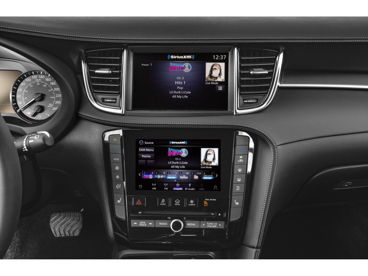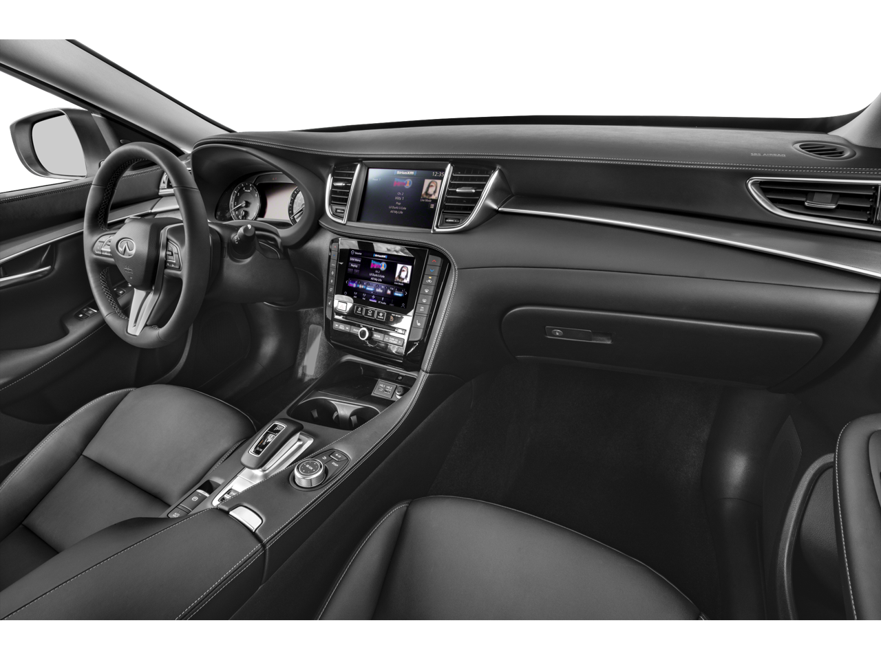 - Radio: HD Audio System -inc: INFINITI InTouch, INFINITI InTouch services, INFINITI InTouch dual display system w/upper 8" and lower 7" HD touch screens, wireless Apple CarPlay, Android Auto, HD radio technology, SiriusXM radio w/advanced audio features and 90-day complimentary trial, INFINITI voice recognition, Siri Eyes Free, Wi-Fi hotspot and active noise cancellation
