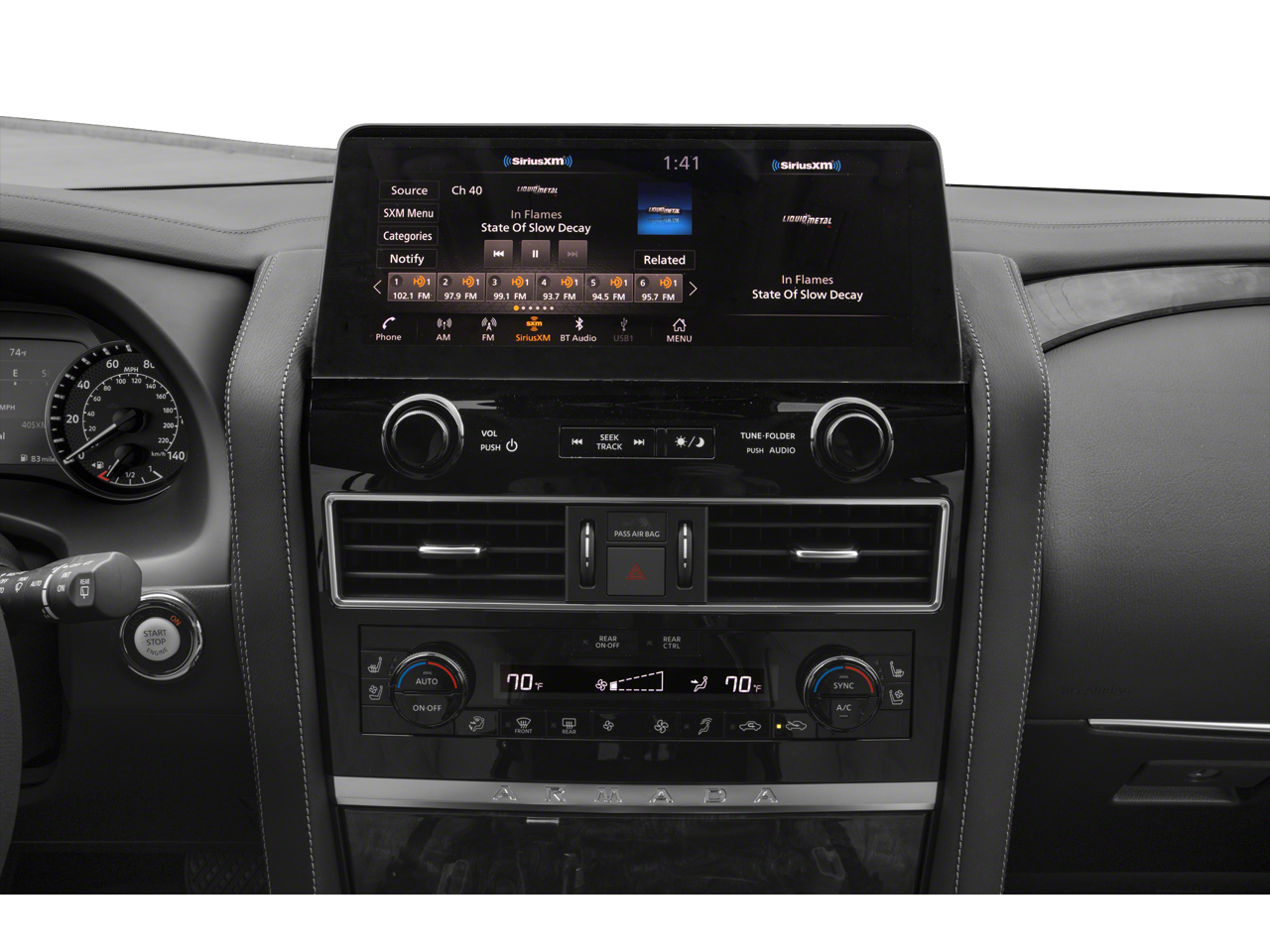 - Radio: NissanConnect w/SiriusXM -inc: Alexa Built-in, wireless Apple CarPlay, Android Auto, Nissan door to door navigation, 12.3" color display w/multi-touch control, SiriusXM Traffic and Travel Link w/3 month complimentary trial access, NissanConnect services powered by SiriusXM, Bluetooth® hands-free phone system, hands-free text messaging assistant and Wi-Fi hotspot